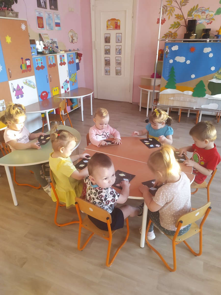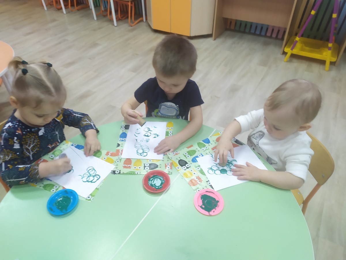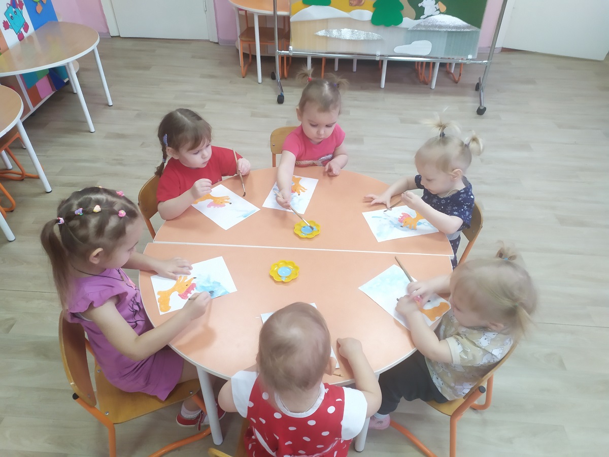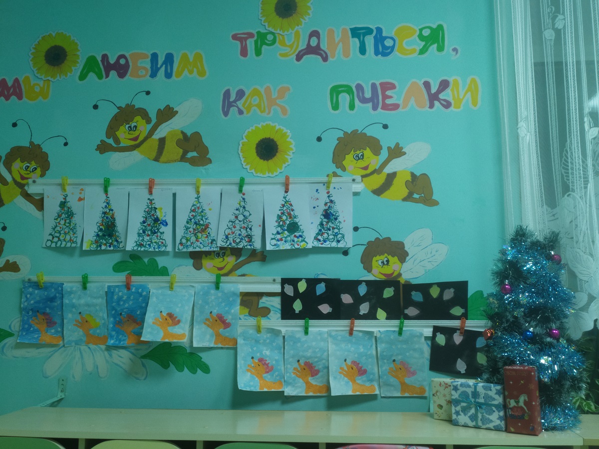 Малыши второй группы раннего возраста рисовали зимний пейзаж с использованием изоленты, «сказочную елочку» с помощью картонных втулок. Новогоднюю светящуюся гирлянду цветными мелками. Искали снежинки нетрадиционной техникой рисования акварель по воску.