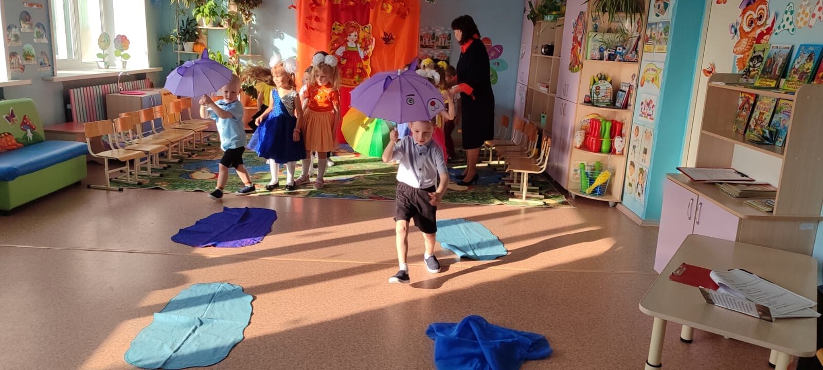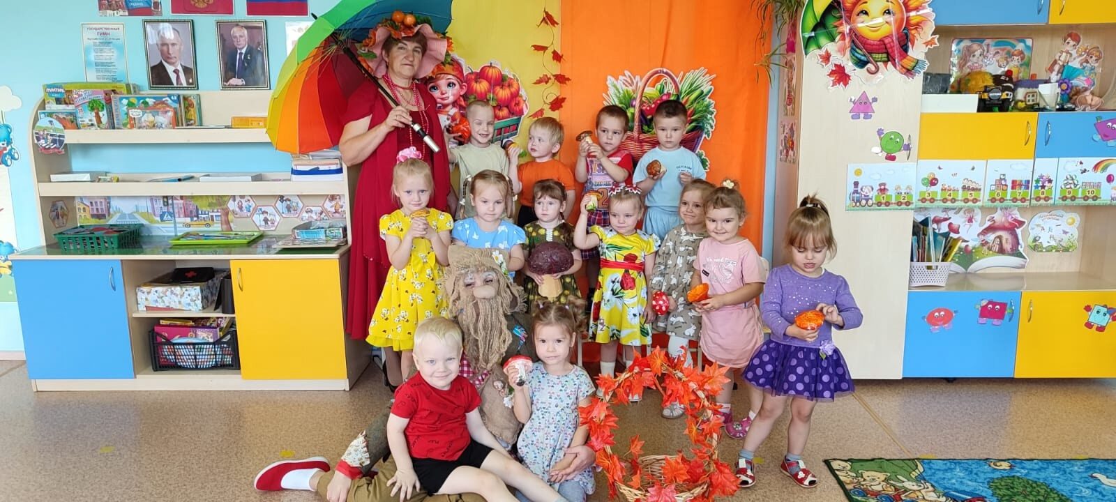 У многих Осень – любимое время года. Meдлeннo кружась в воздухе, падают c деревьев лёгкие, невесомые жёлтые листья. Прозрачен и чист воздух, шелестит под ногами опавшая листва, дышится легко. Одним словом — осенняя пора. Самыми первыми в нашем детском саду осенний праздник отпраздновали воспитанники группы раннего возраста в детско-родительском клубе «Золотая Осень». В гости к ребятам пришла красавица — хозяйка Осень, (Кузнецова Т.А.) с которой дети вместе с родителями отправились в увлекательное путешествие в осенний лес. Вместе они собирали листочки и шишки, пели песни, танцевали, играли в игры с зонтиком и дождиком. А самым ярким и запоминающимся эпизодом стал сюрпризный момент – корзина с яблоками от осени для всех ребят и мастер — класс по изготовлению аппликации из осенних листочков! Дети подготовительной к школе группы, благодаря солнечным и погожим денькам смогли провести свой осенний праздник на улице. Для детей это запоминающееся радостное и яркое развлечение, которое помогает им закрепить представления об осени, как времени года. Весь процесс подготовки к празднику побуждал видеть осеннюю природу во всей её красе, радоваться этому и не быть равнодушным к ней. Главной героиней, конечно же, была красавица Осень! (Васюкова И.М). В гости к ребятам пришёл сказочный персонаж: Кощей Бессмертный (Герман Е.С.), который приготовил много разных испытаний, для того чтобы, наконец – то встретиться с Королевой Осенью. Все задания дети выполняли с большим азартом и желанием. И, конечно, добро всегда побеждает зло… Следующая осенняя встреча была у детей средней группы с болтливой Вороной (Герман Е.С.). и с ворчливым Лесовичком (Васюкова И.М.), который вредничал и капризничал, и не хотел помочь позвать ребятам Осень (Рындина Т.В.). Дети пели песни «Желтый лист» и «Осенью», учили старичка — Лесовичка танцам, играли в веселые игры «Антошка», «Оббеги лужи», «Собери урожай», загадывали загадки — обманки. В результате такого веселья у Лесовичка поднялось настроение, и он помог ребятам встретить красавицу Осень. По завершению праздника щедрая Осень наградила ребят сладкими призами. Для детей младшей группы прошёл замечательный веселый праздник «Грибная электричка». Ребята путешествовали по разным лесным остановкам, на которых они выполняли задания, пели, играли, отгадывали загадки, очень много смеялись встречая весёлого Лесовичка (Герман Е.С.) и Осень (Нестеренко Л.В.). По окончанию праздника детей угостили волшебными грибочками. Настроение у всех детей было приподнятым! Дети веселились и играли! Все были в восторге, о чем рассказывают наши фотографии и видео. Осенние праздники удались на славу! Спасибо нашим героям за доставленную радость!