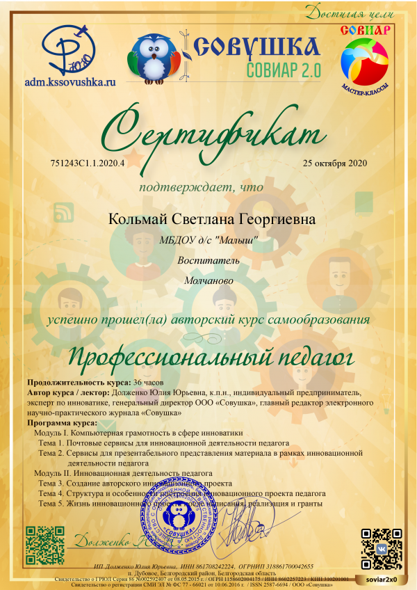 Стаж педагогической деятельности: 20 лет;