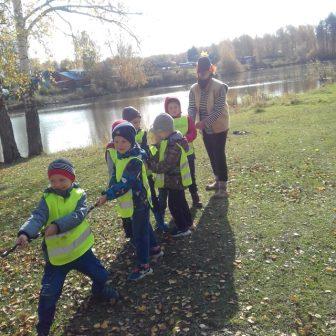 Перед началом как и положено воспитатель Кольмай С.Г. провела инструктаж по ПДД, а инструктор физвоспитания Рындина Т.В. игры «Что возьмем с собой в поход» и «Я в гостях у леса». Рассмотрев карту, ребята наметили маршрут и взяв хорошее настроение, отправились в путь. А в лесочке их поджидал сюрприз — встреча с Лесовиком (инс-ор физвоспитания Рындина Т.В.). Лесовик приготовил для ребят веселые испытания: прыжки в мешках, попади шишкой в ведро и предложил помериться силой, перетягивая канат. Ребята все испытания прошли с задором. Затем Лесовик спросил: а знают ли ребята правила поведения в лесу? Закрепили. Потом любовались отражением осеннего леса в озере, плывущими осенними корабликами-листочками по воде. Прижавшись к березке попросили у нее сил и здоровья на весь год. Гоняли в футбол, шуршали листвой и устраивали листопад. И конечно же самое долгожданное -пикник. Пусть он был в этом году без костра, но ребята с удовольствием отдохнули на лесной полянке, делясь впечатлениями, угощались вкусняшками. Лесовик с миром отпустил всех и пригласил на трудовой десант, который ежегодно проводит наш детский сад на берегу озера. Все были счастливы и довольны.