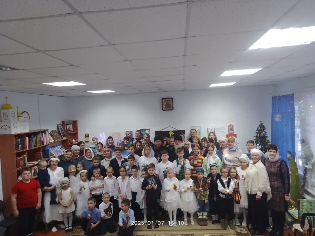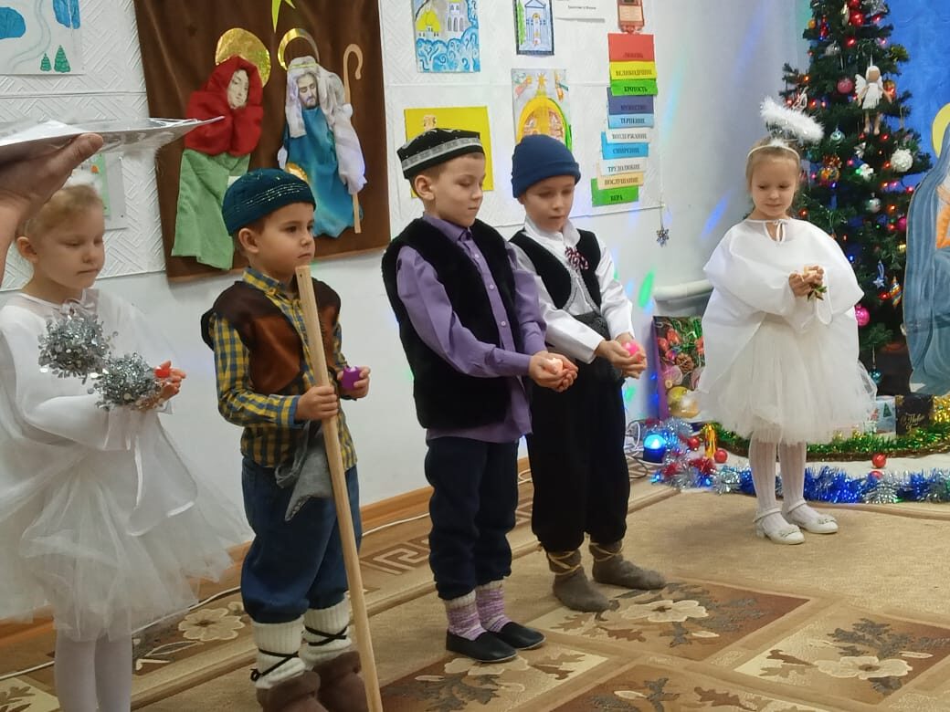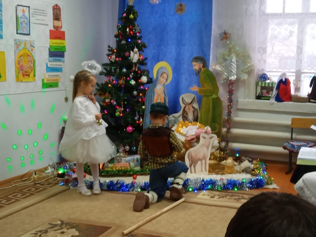 По окончании Всенощного бдения прихожане, дети, родители и гости собрались, чтобы вместе прославить Рождество Христово. Дети Воскресной школы к торжеству готовились основательно: учили слова, оформляли зал, подготавливали атрибуты для спектакля. Ребята под руководством Майковой Галины Павловны подготовили Рождественское представление, а так же исполнили Рождественские песни, тропарь, прочитали стихи, играли с вдохновением сценку, старались поделиться радостью своих сердец о Родившемся Богомладенце со всеми присутствующими! И это им удалось. Атмосфера, в которой проходил праздник, была потрясающей, душевной и спокойной! Также всех прихожан и гостей Праздника Рождества Христова поздравил настоятель Храма отец Иоанн и Галина Павловна. Наш детский сад «Малыш» тоже принял участие в Рождественской встрече, он подготовил для маленького Иисуса подарок – сценку «Ангелы и пастухи» и песню «Восковые свечечки». Теплом своих сердец в Рождество поделились и учащиеся, учителя МСОШ №2. Учащиеся прекрасно сыграли роли в кукольном спектакле, отразив неповторимый характер персонажей сказки «Рождественский колобок», передав настроение своей куклы, вдохнув в неё жизнь так искренне, что дети поверили в их существование и смотрели на театральную ширму затаив дыхание…. Бесконечно долго захотелось детям и взрослым прибывать в атмосфере прекрасной рождественской музыки и блеске новогодней ёлочной гирлянды. В завершении праздника Галина Павловна обратилась к собравшимся с проповедью о Рождестве Христовом, а затем поблагодарила педагогов и воспитанников за прекрасные выступления, а взрослым слова благословения за труды в деле духовно-нравственного просвещения подрастающего поколения.