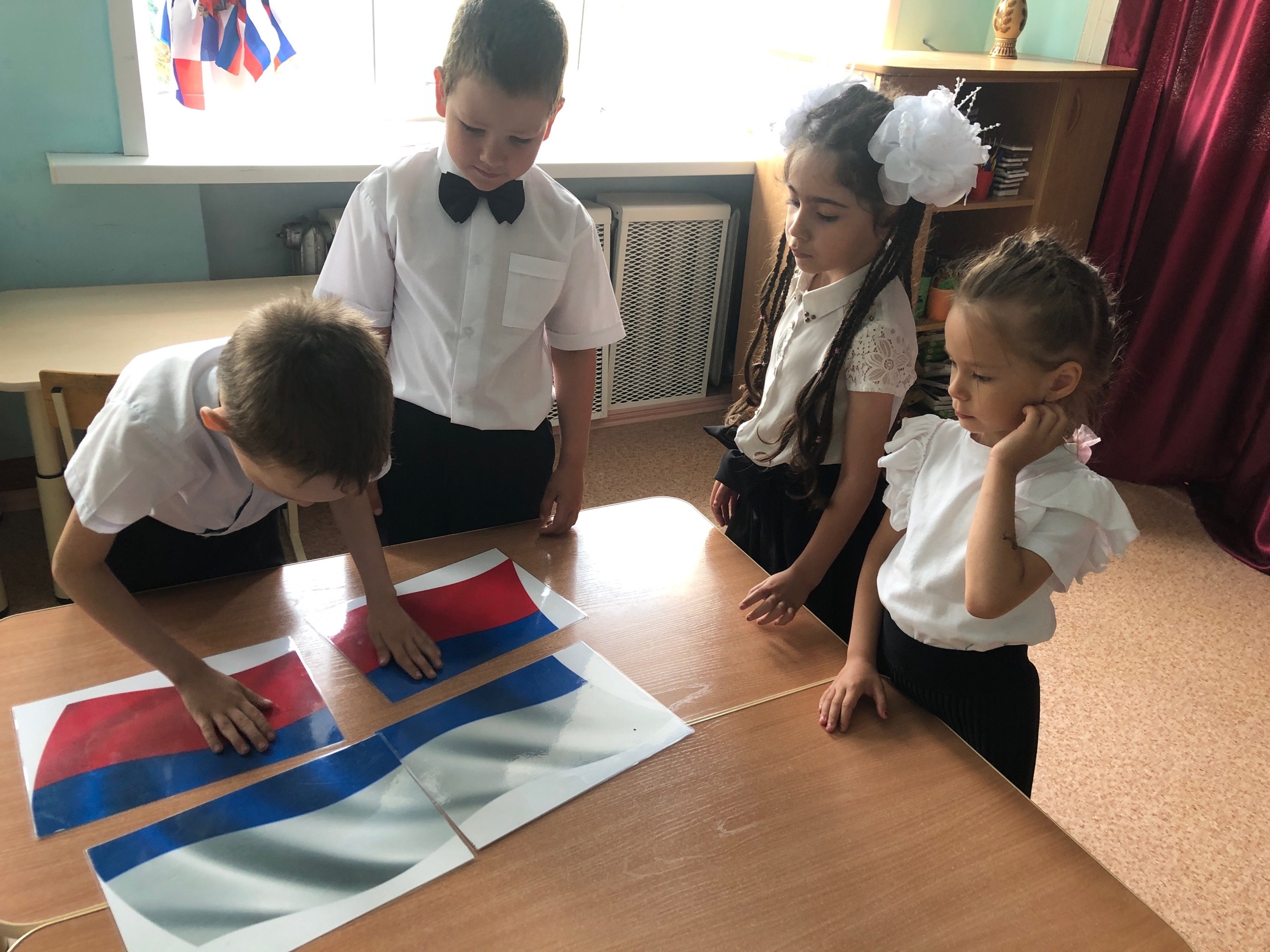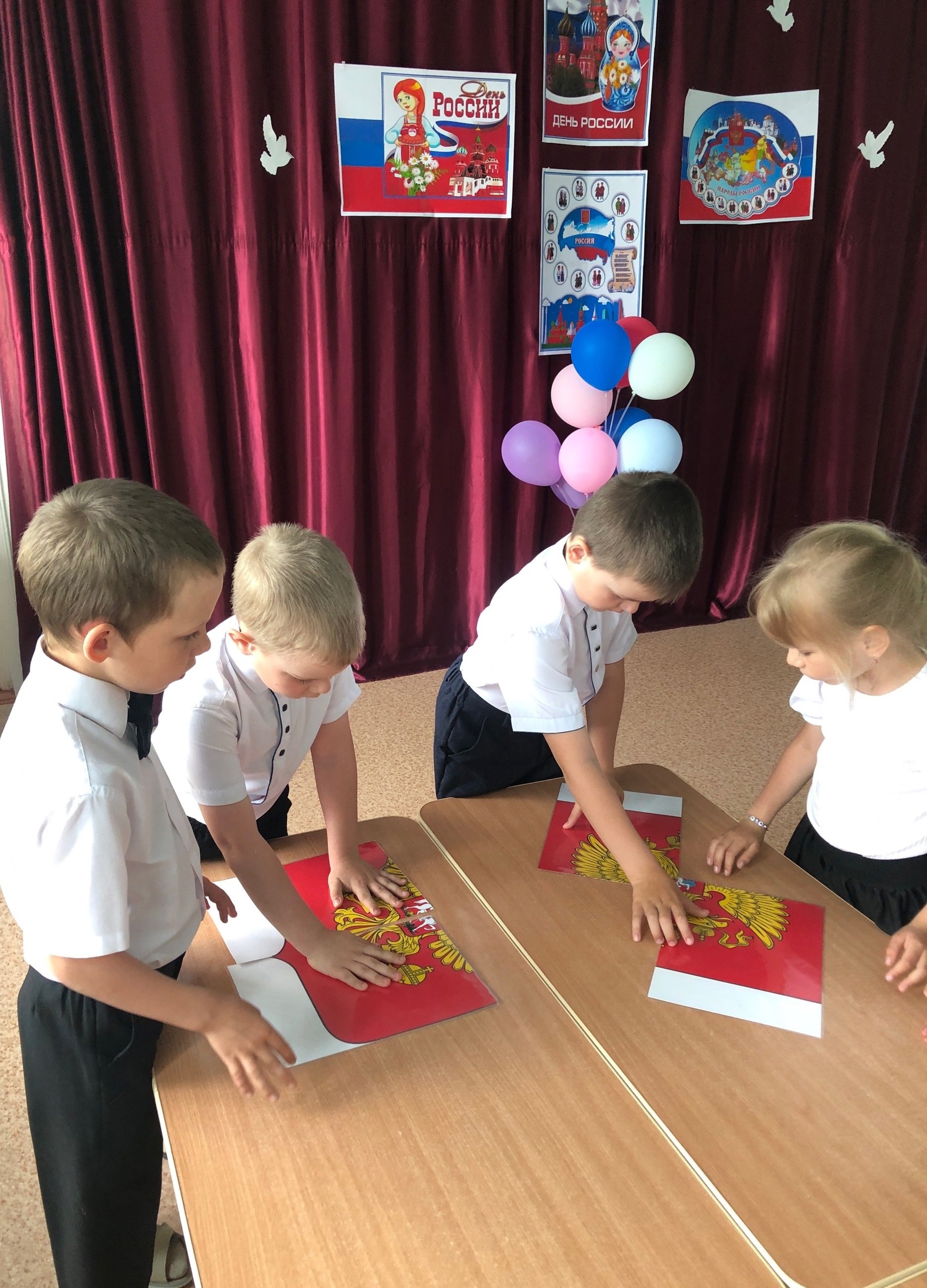 В подготовительной к школе группе прошло тематическое занятие с просмотром презентации. Дети наглядно смогли увидеть насколько большая наша страна, сколько народов живет на ее обширной территории в мире и согласии, закрепили цвет нашего флага, и составили флаг из пазл. Педагоги рассказали о гербе России, на котором изображён двуглавый орел, головы которого смотрят в разные стороны. Орел обозначает силу. Это значит, что государство сильное и непобедимое.