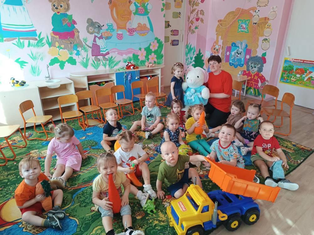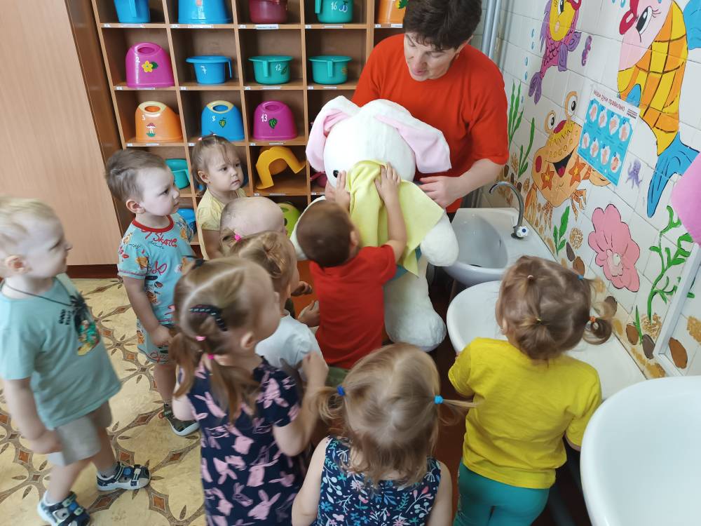 Во II группе раннего возраста прошло развлеченье «В гости зайка к нам пришёл». Дети весело встретили Зайку, погладили его, научили правильно умываться — помыли ему носик, глазки, щёчки, угостили вкусной морковкой и весело с ним поиграли.