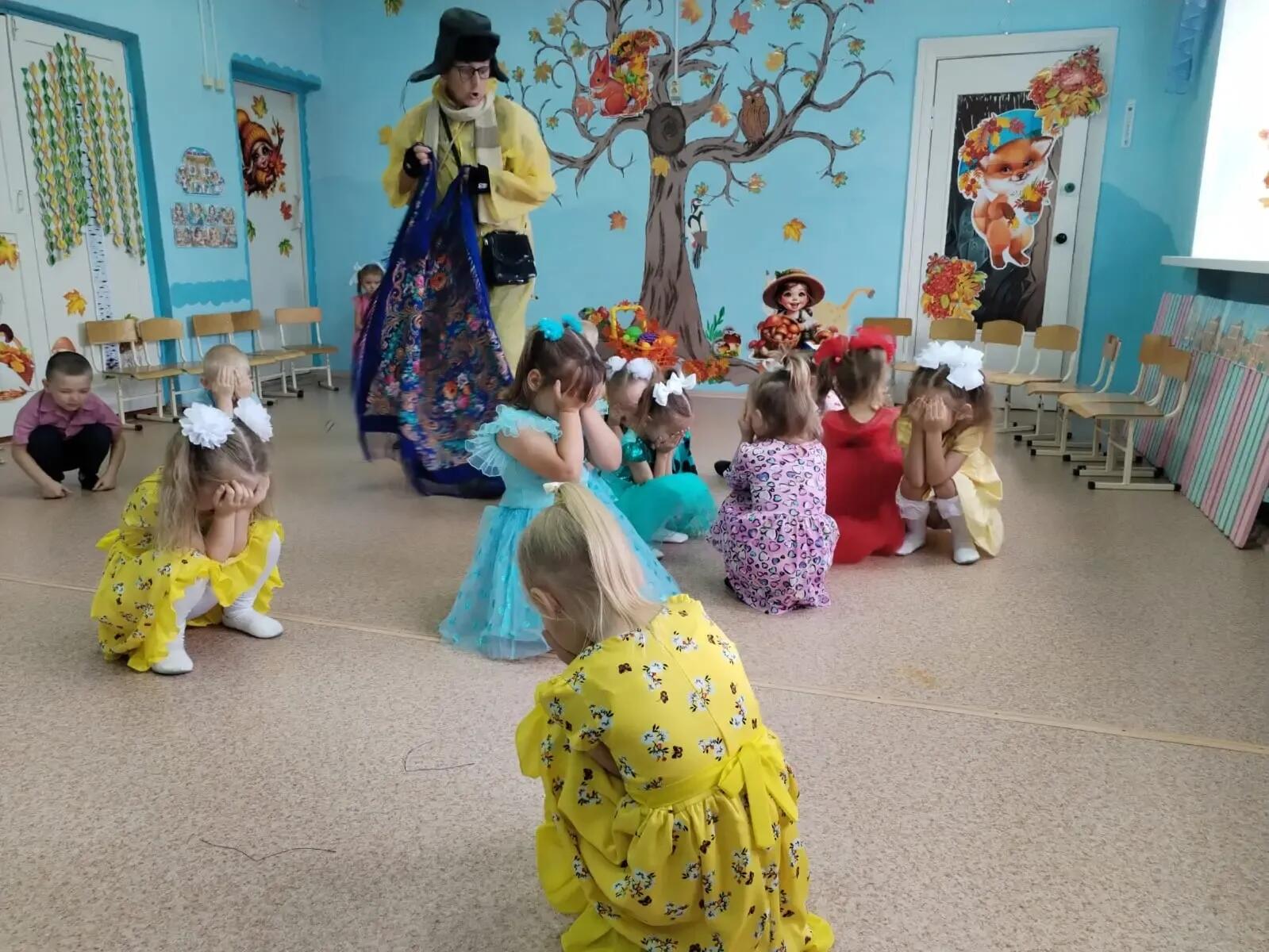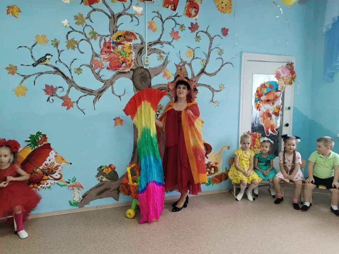 3 октября, наш импровизированный зал превратился в сказочный осенний лес, в котором прошел праздник «В кафе у Слякоти Холодрыгишны». Ребята читали стихи о красивой осенней поре, исполняли танцы с листочками, с удовольствием играли с Хозяйкой Осенью (Нестеренко Л.В.) в веселые игры: «Тучка, тучка приходи!», «Осенью», и «Осенние потеряшки», журили Слякоть Холодрыгишну (Рындина Т.В.) за проделки. На утреннике царила атмосфера сказки. Сказочная осень пробежала быстро, но осталась в памяти детей и взрослых приятными впечатлениями. На прощание Слякоть попросила прощение, сказала, что исправилась — будет хорошей и пригласила ребят в своё сказочное кафе и угостила всех вкусным осенним яблочным соком.