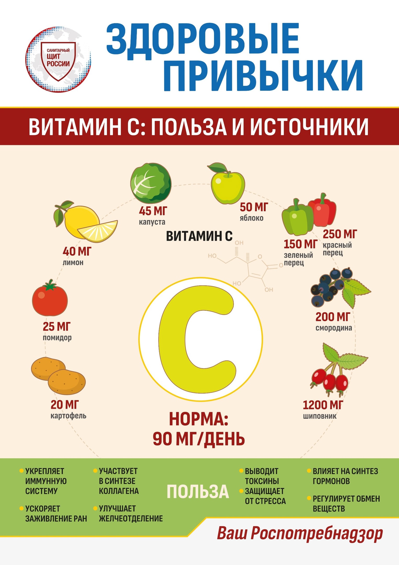 Аскорбиновая кислота является мощным антиоксидантом, положительно влияет на нервную систему, укрепляет сосуды, нормализует кровообращение, укрепляет иммунную систему, защищает наш организм от вирусов и бактерий. Витамин C был открыт в поисках средства от цинги.